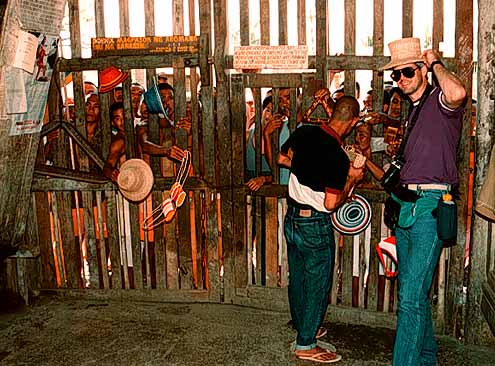 Purchasing hand-made crafts from inmates of the prison colony on the Island of Palawan. Kurt is trying on a straw hat. The prisoner outside the gate is holding a colorful hat woven of plastic. This was the only place in the Philippines we saw plastic hats, and for good reason, they were ugly.