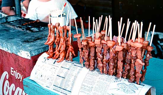 Local food grilled and served on the street corner. On the left are chicken feet on a stick called Adidas after the popular name brand of shoes.