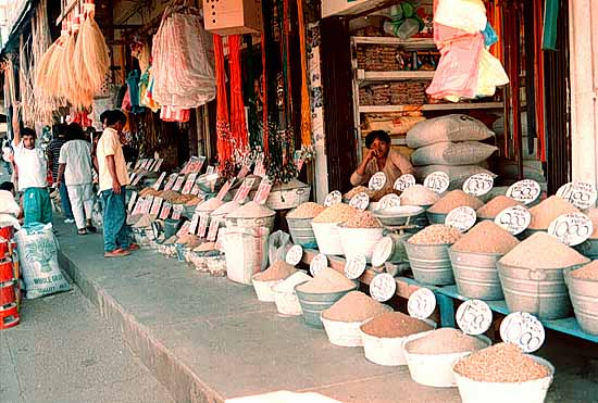 Rice and other grains in the Puerto Princessa market on the island of Palawan. The top row is various brands of rice, the middle row is corn and the bottom row was different types of pig foods. In the upper left of the frame there are some handmade brooms and other items for sale in the adjoining shop.