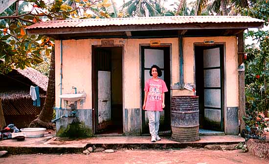 Lani outside a bathroom near the town of Sabang on the Island of Palawan. The large drum between the doors contains the water which is used for flushing, bathing and washing (no toilet paper is provided). A bucket is used to carry the water into the bathroom.
