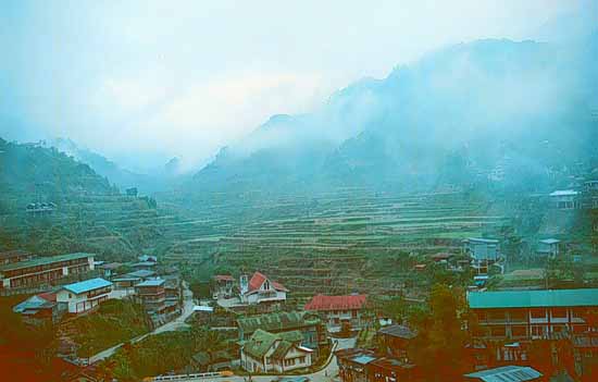 Sunrise in the town of Banawe. Clouds hang heavy in the high mountains as the awaking town starts to the rice fields for another day's work.