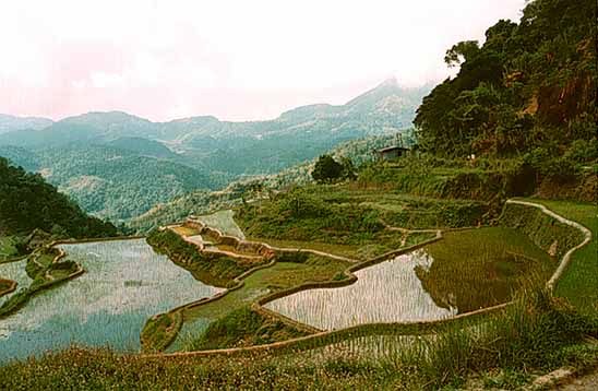 Rice terraces in the mountains above the town of Banawe. Carved out of the mountains over 2000 years ago, these rice fields are considered the eighth wonder of the ancient world. These fields have recently been prepared for planting. Young seedling rice is grown in a cluster in one section of the field. It is then pulled up and individual plants are placed in the mud at intervals of five to six inches apart.