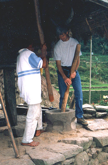 Jose showing kurt how to pound rice into flower.