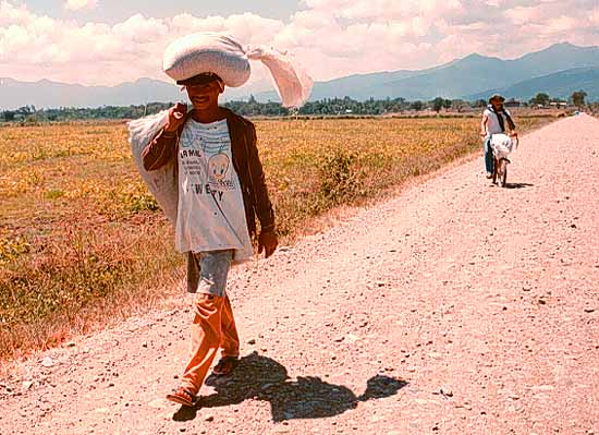 Prisoner carrying a bag along a road just outside the Iwahig prison colony.