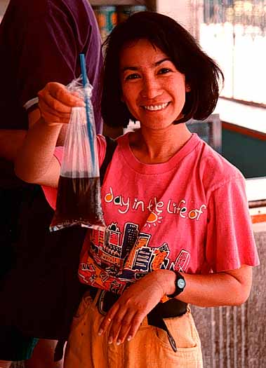 Purchasing a Coke from a roadside vendor on the road from Manila to Banawe. The trip by bus took ten and a half hours and a coke was a welcome diversion. Coke and all other soft drinks exist almost extensively in bottle form. In the Philippines pop bottles are worth more than the fluid itself. When purchasing a drink to go, the bottle must be returned to the vendor. The Filipino's solve this problem by pouring the drink into a small clear plastic bag and putting a straw in it.