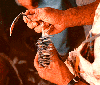 Close-up view of the sharp blade strapped on the chicken's leg before the fight.